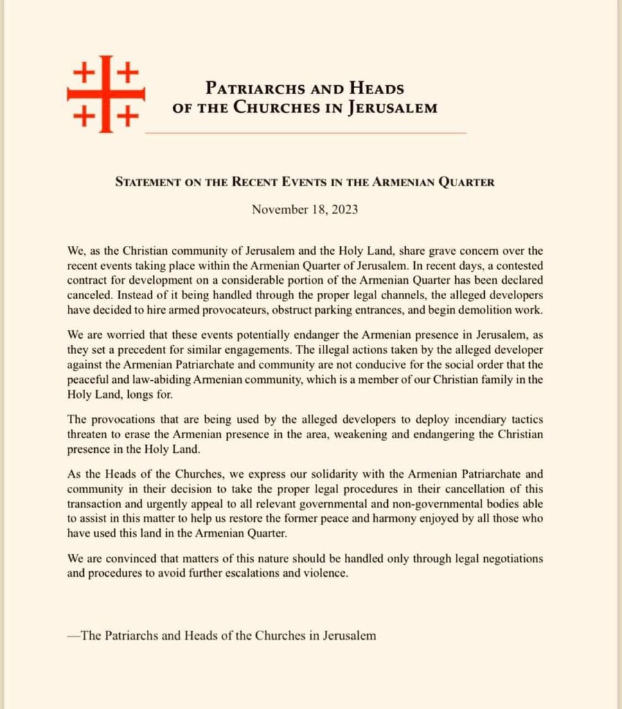 Երուսաղեմի Հայկական թաղամասի վերաբերյալ Երուսաղեմի պատրիարքների և եկեղեցիների ղեկավարների հայտարարությունը` խիստ մտահոգությունները և աջակցությունը: