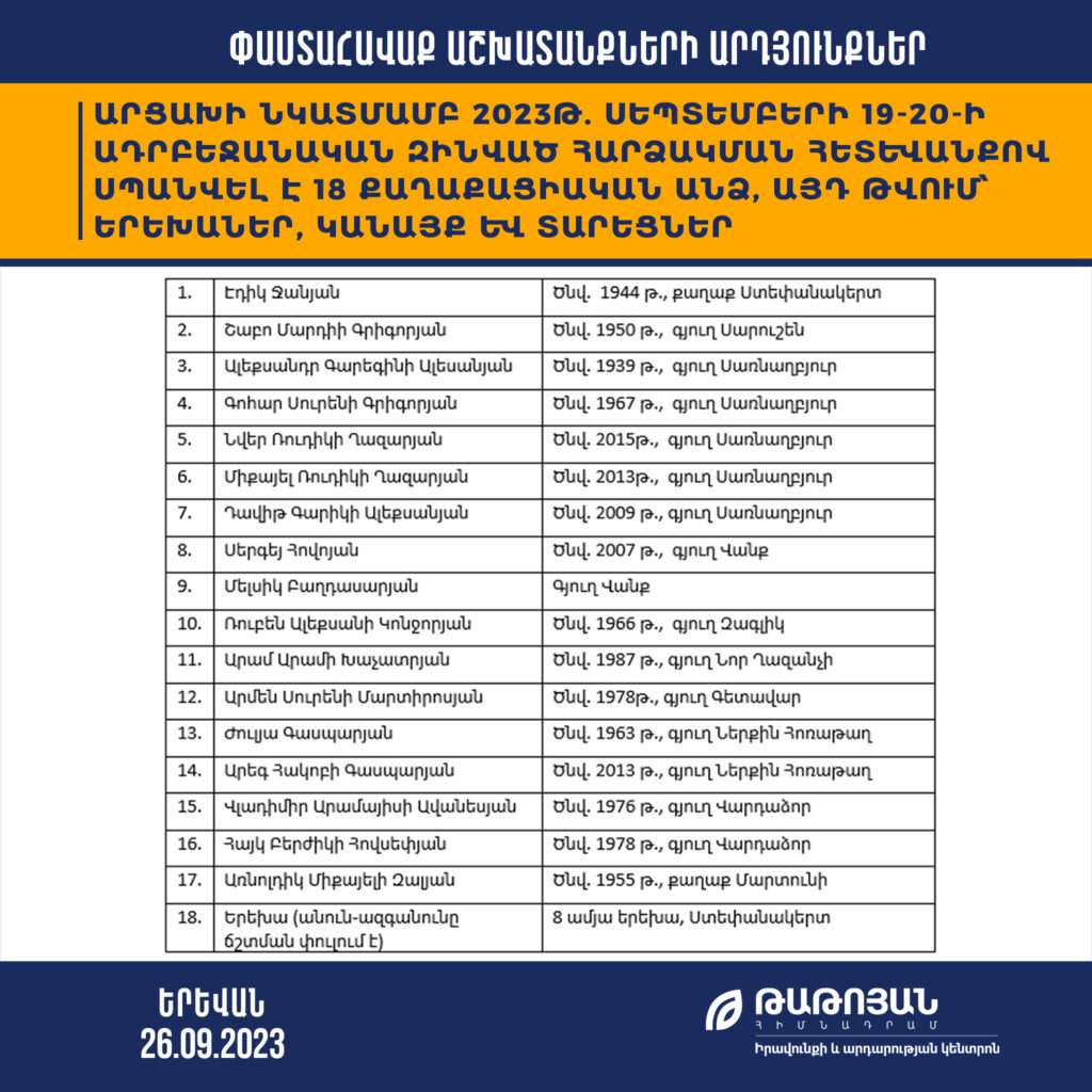 Արցախի նկատմամբ 2023թ. սեպտեմբերի 19-20-ի ադրբեջանական զինված հարձակմամբ ադրբեջանական զինված ծառայողները սպանել են 18 քաղաքացիական անձի, այդ թվում՝ 6 երեխա, ինչպես նաև կանայք ու տարեցներ: Նույնականացված տվյալներ
